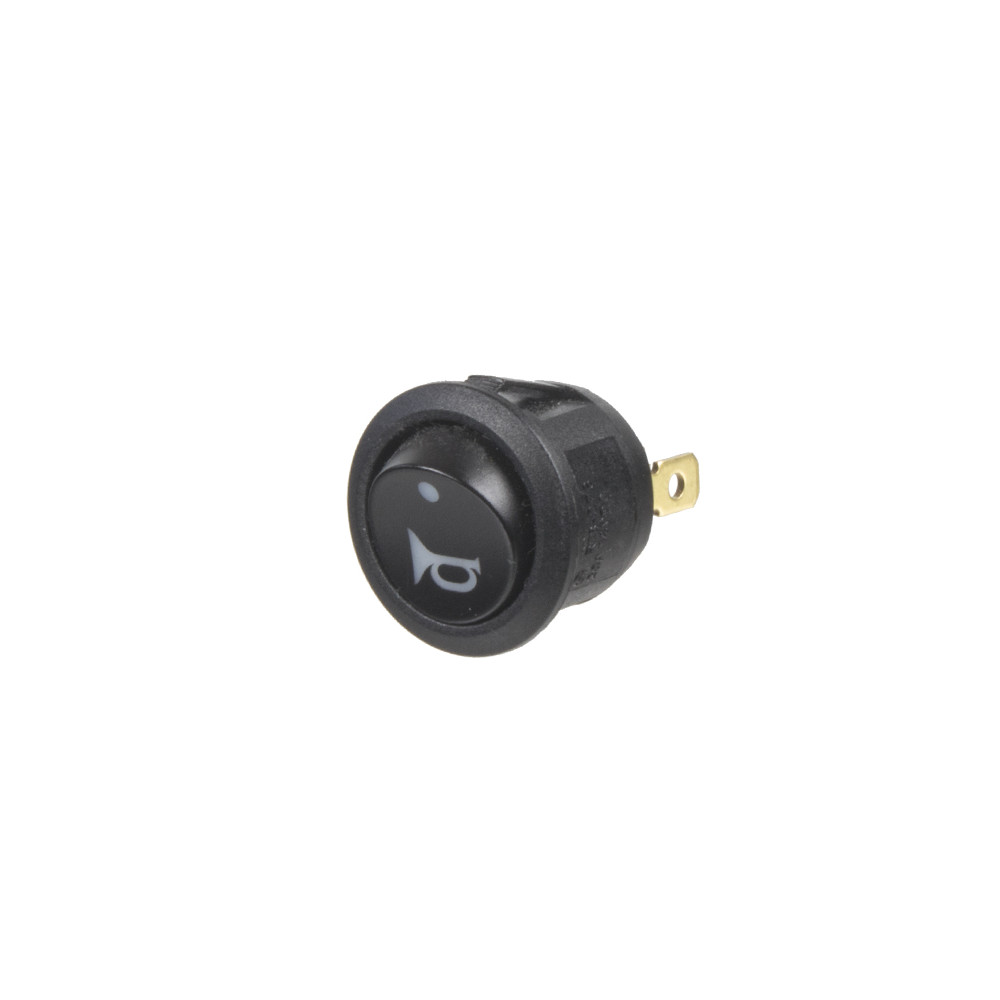Kolískový spínač s okrúhlym tvarom, určený pre napätie 12 V a maximálny prúd 20 A. Spínač je vybavený červeným podsvieteným symbolom sirény a červenou kontrolkou.
