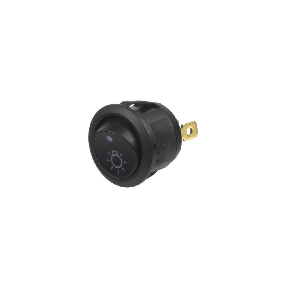 Spínač kolískový okrúhly 20 A so oranžovo podsvieteným symbolom žiarovky a červenou kontrolkou, pre napájacie napätie 12 V / 20 A.